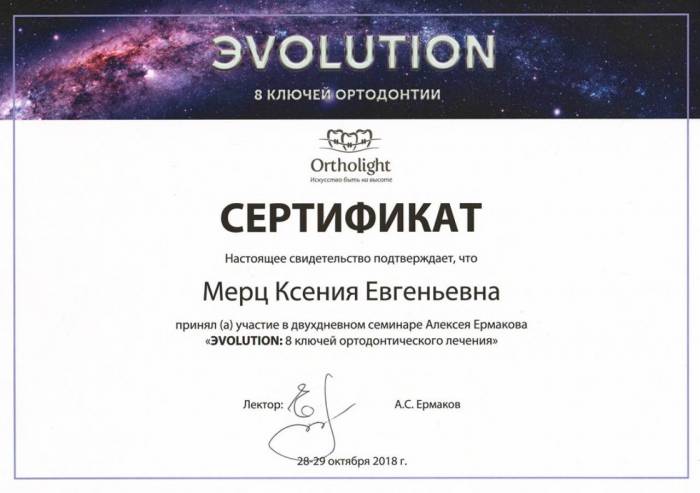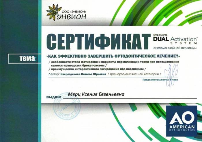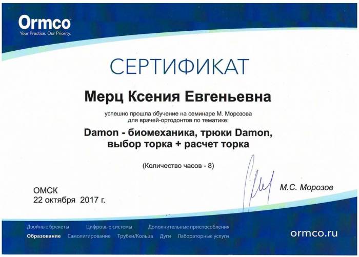 2017 г.- Сертификат участника семинара «Как эффективно завершить ортодонтическое лечение? Особенности этапа юстировки варианты нормализации торка при использовании самолигирующихся брекет-систем. Преимущество интерактивного лигирования над пассивным».