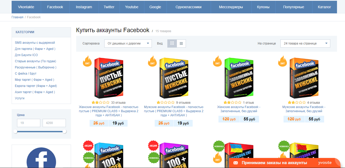 Помимо аккаунтов facebook на главной странице магазина представлен огромный ассортимент учетных записей большинства популярных сервисов и социальных сетей.