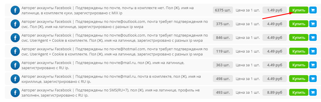 Разберемся, как купить бизнес-аккаунты «Фейсбук». Для этого зайдите в любой магазин, выберите нужный профиль и нажмите на «Купить». Или отложите несколько профилей в корзину, а потом оформите заказ.