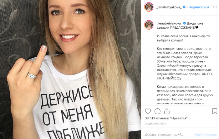 В конце 2018-го Елена на своей страничке в сети Инстаграм, где у нее свыше 220 тыс. подписчиков, выставила фото с помолвочным колечком на безымянном пальце. В подписи под фотографией Третьякова подтвердила, что ей сделали предложение, и она вскоре выходит замуж. Теперь ее преданные поклонники с нетерпением ждут сообщений о скорой свадьбе.