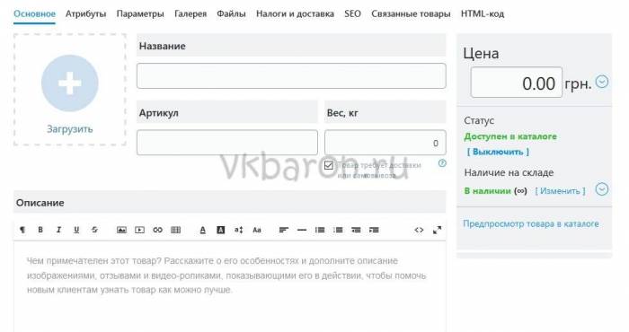 Также, можно указать есть ли сейчас товар в наличии или нет. Добавьте таким же способом все товары, которые вы хотите продавать через ВКонтакте.