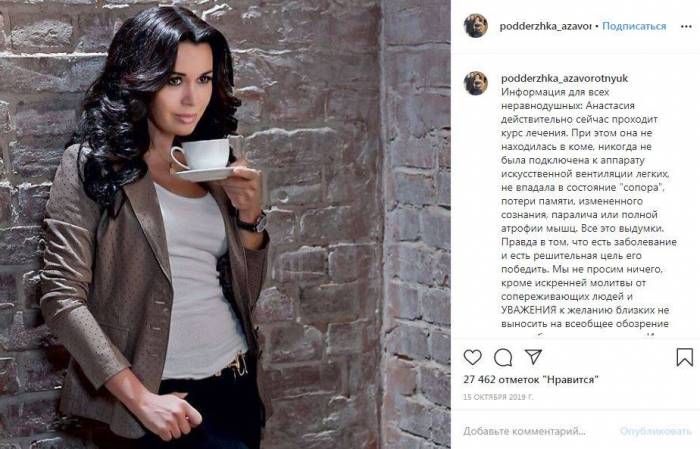 Позже родные завели аккаунт в Instagram, где они развенчали слухи касаемо состояния актрисы. Анастасия Заворотнюк никогда не впадала в кому и не подключалась к аппарату искусственной вентиляции легких и не теряла память. Однако она действительно перенесла операцию и проходит курс реабилитации.