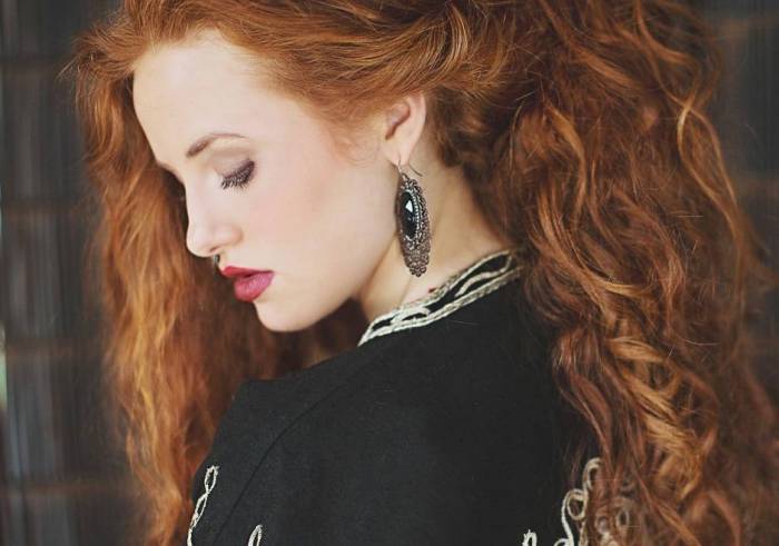 Густая копна красных волос, длинные наклеенные ресницы и макияж привлекают внимание к её личности