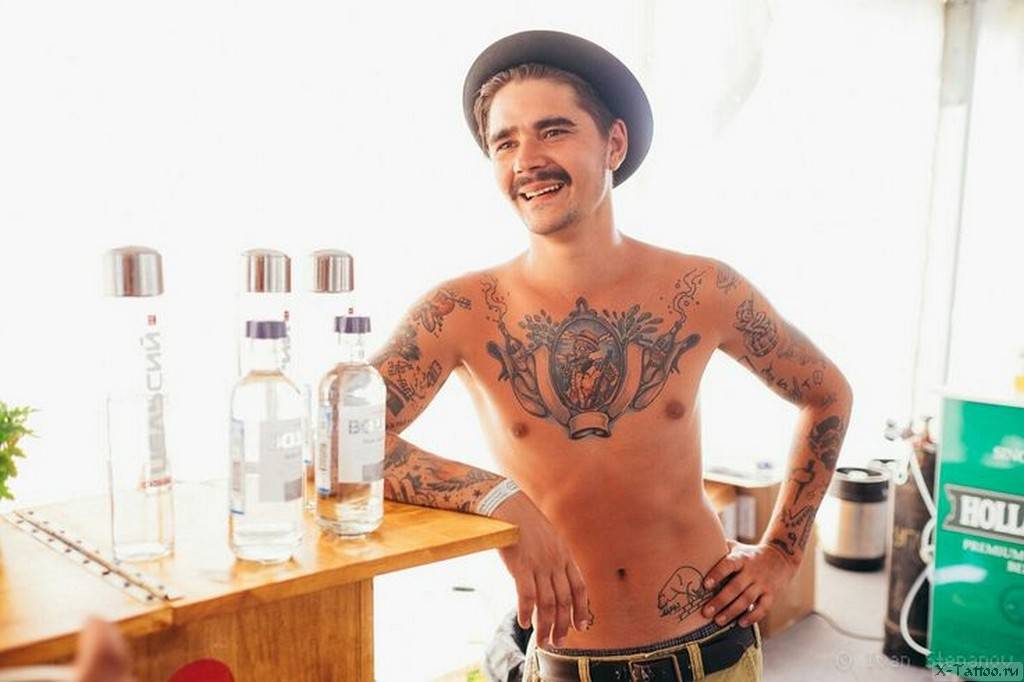 Грудь певца украшает большое изображение скелета-скрипача в рамочке с бутылками по углам.