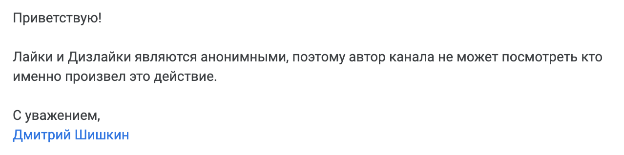 → Отметим сразу, имени дизлайкера вы не сможете узнать сразу. Поскольку такую информацию сервис не предоставляет !!! — Пример ответа Админа ⇓