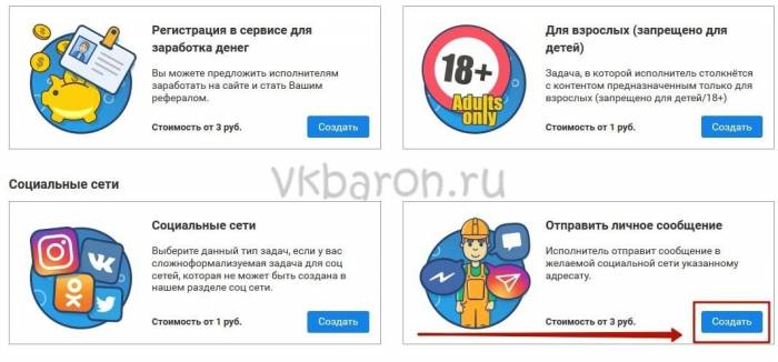 На новой странице указать тип задания «Отправить личное сообщение» (от 3 рублей) или «Произвольная» (от 1 рубля). Кликнуть по кнопке «Создать».