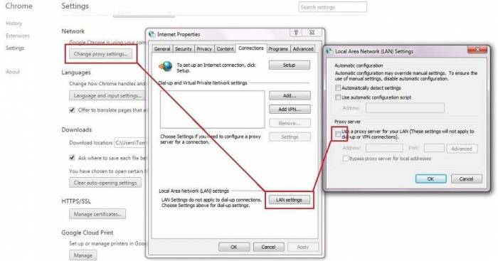 Sometimes, you have used proxies with your Google Chrome or Internet Explorer and forgot to remove them after using. To resolve the “This webpage is not available” error, please check your proxy settings again and make sure you have not checked the “Proxy Server” option as below.