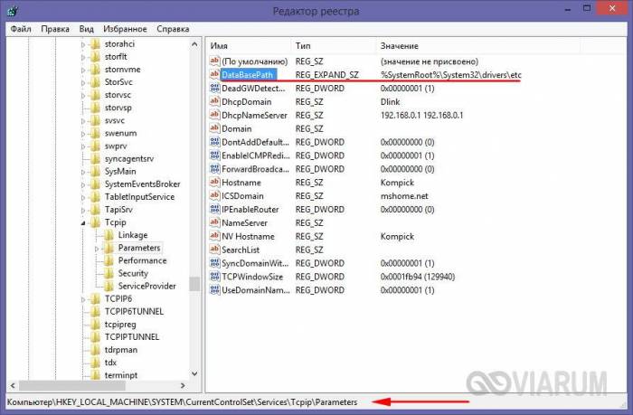 Примечание: некоторые программы в целях безопасности могут перемещать файл HOSTS. Если у вас он не обнаружится в указанном расположении, воспользуйтесь встроенным поиском Windows или посмотрите значение параметра DataBasePath в ключе системного реестра HKEY_LOCAL_MACHINE/SYSTEM/CurrentControlSet/Services/Tcpip/Parameters, оно и будет содержать путь к файлу HOSTS.