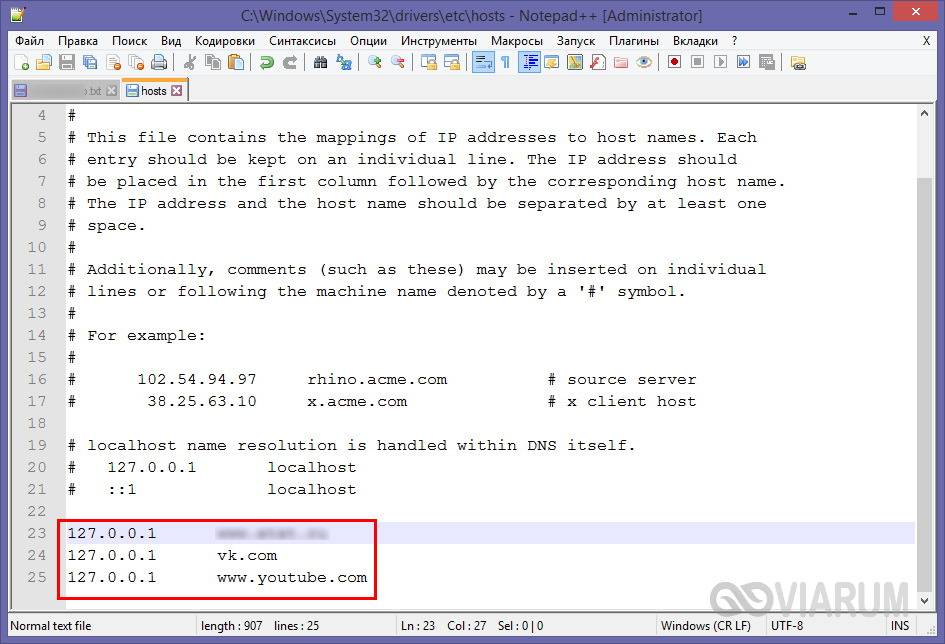 Заблокировать Вконтакте мы сможем с помощью системного файла hosts