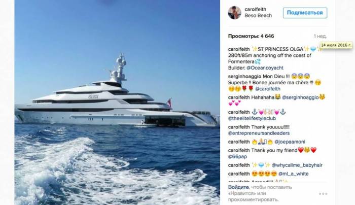 Теоретически Игорь Сечин мог арендовать яхту для своей жены. Но даже при его официально высоком заработке аренда St. Princess Olga сильно ударила бы по семейному бюджету. Предложения по недельной аренде яхт, подобных St. Princess Olga, начинаются от 1 млн долларов. А, судя по фотографиям, Ольга Сечина за последние три года провела на яхте совсем немало времени.