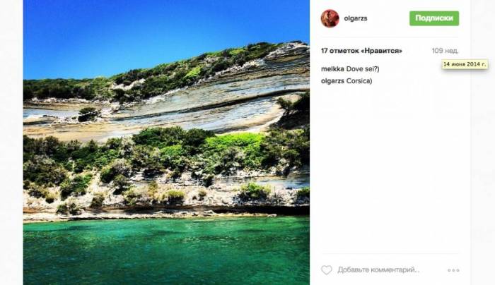 14 июня 2014 года Сечина опубликовала фотографию живописного скалистого берега (Фото 14). Ее подписчик в Instagram спросил по-итальянски: «Ты где?» «Корсика», — ответила Сечина. И вновь ровно в этот же день, по данным системы АИС, яхта St. Princess Olga находилась возле Корсики (Фото 15).
