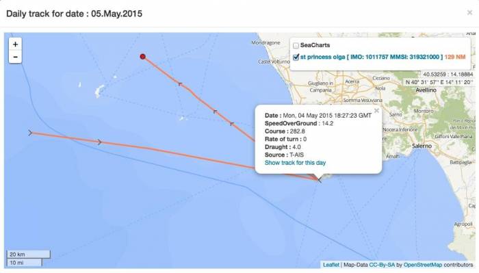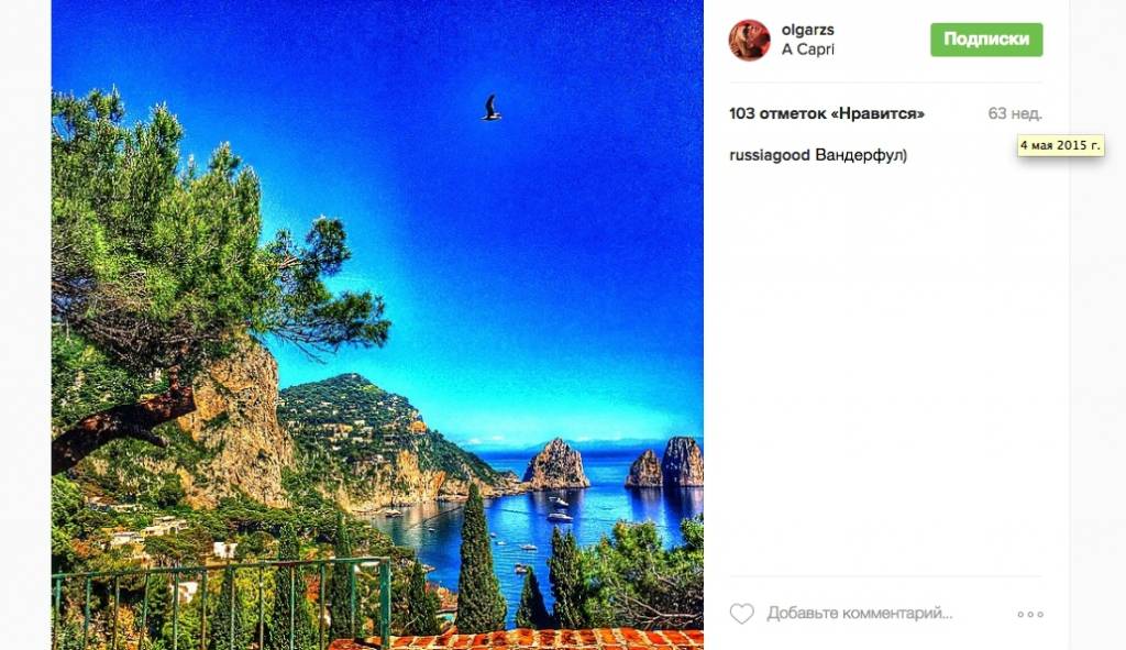 4 мая 2015 года Ольга Сечина выложила в Instagram фотографию с острова Капри (Фото 12). И снова в этот же день, 4 мая, система АИС показывала, что яхта St. Princess Olga находилась возле того же острова Капри (Фото 13).