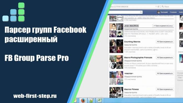 - Необходимо задать поиск групп на сайте фейсбук по ключевому слову.
