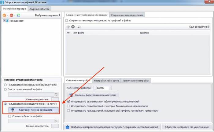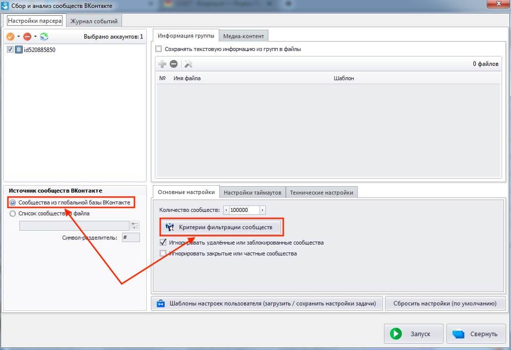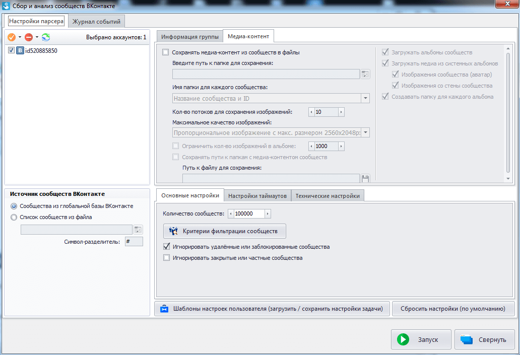 - Выбрать один из способов парсинга: в промежутке между заданными ID или из указанного сообщества.