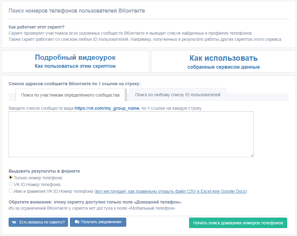 Онлайн-парсер, умеющий собирать различную информацию и контент во ВКонтакте, в том числе и номера телефонов. Собрать их можно двумя способами: