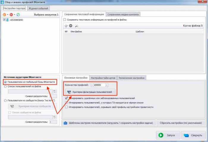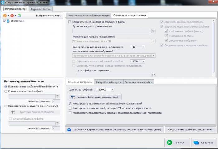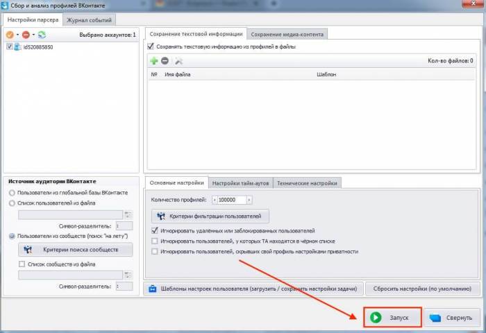 Для запуска парсера аудитории нужно настроить параметры поиска. Здесь всё индивидуально, возможности по настройке критериев у каждого приложения свои. Обычно сразу же предлагается выбрать, что нужно сделать с результатом парсинга: сохранить в БД или сразу же экспортировать в файл и сохранить на компьютер (для онлайн приложения – передать по почте).