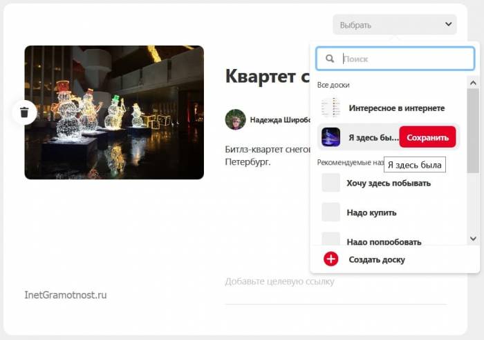 Рис. 5. Выбираем доску, после чего можно сразу сохранить картинку в Пинтерест на выбранной доске.