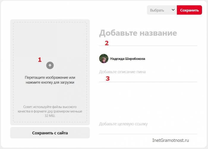 Откроется окно, в котором можно добавить картинку со своего устройства или просто перетащить ее (1 на рис. 3). Кроме того, надо ввести название для нового пина (2 на рис. 3) и добавить для него описание (3 на рис. 3), чтобы другие пользователи могли его найти.