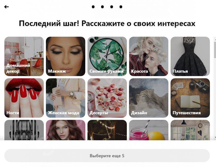 Как только Вы начнете регистрацию, Вам будет предложено «с ходу» выбрать 5 интересных коллекций, после чего Вы попадете в соцсеть. Возможно, что на почту Вам будут периодически присылать самые интересные пины из тех коллекций, которые Вы выбирали как интересные.