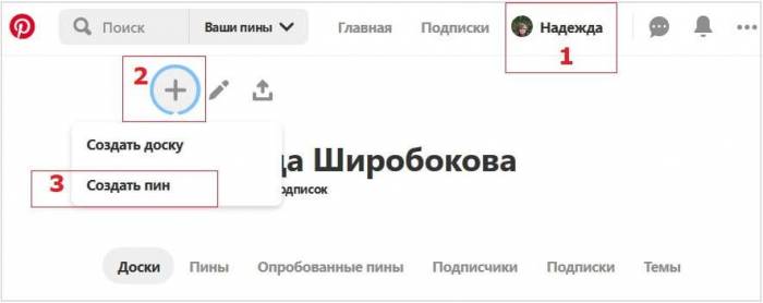 Создание пинов подразумевает несколько вариантов: создание собственной публикации, сохранение контента других пользователей на свои доски или через ссылки на сторонние источники. Пользоваться сайтом Пинтерест для этого просто: достаточно нажать на иконку в виде плюсика. Она находится в верхнем правом углу.