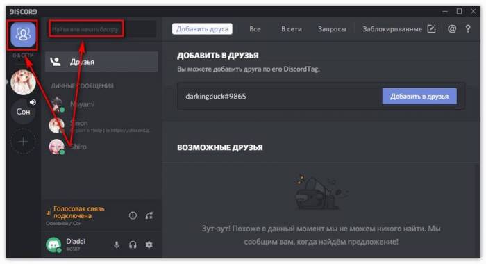 Для вызова меню необходимо нажать на большую клавишу «Добавить друга», расположенную в верхней части экрана. Вбить в строку поиска номер ID либо электронную почту человека для последующего добавления в контакт-лист. ID пользователя выглядит примерно как “Vladimir777#7655”