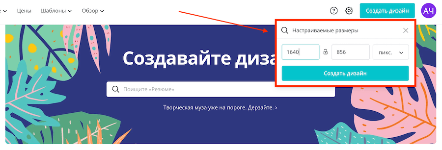 Шаг 2. После прохождения регистрации, на которую у вас уйдет не больше пары минут, вы окажетесь на странице выбора дизайна. В правом верхнем углу кликаем «Создать дизайн — Настраиваемый размер» и вводим 1640 на 856 пикселей.