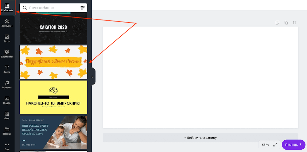Шаг 3. Перед вами откроется чистый лист. Справа, в разделе «Шаблоны» можно выбрать готовый вариант дизайна, которые адаптируется под заданные нами размеры.