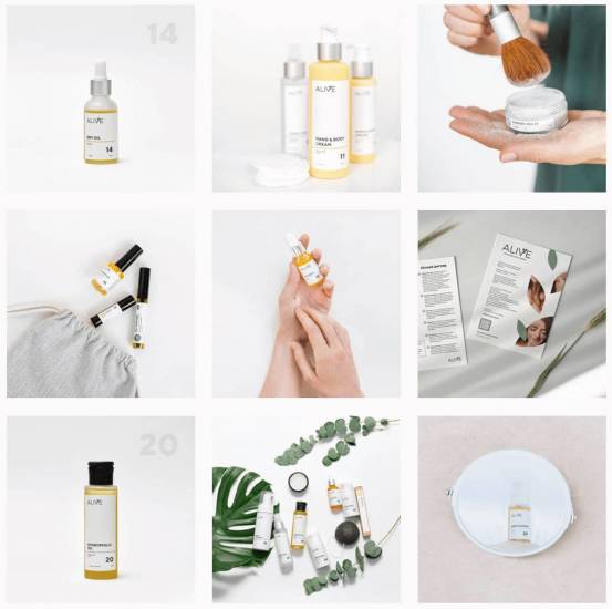 Источником Инстаграм-вдохновения для этого приема послужит аккаунт бренда натуральной косметики ALIVE. Оформление отлично вторит стилистике бренда и создает атмосферу простоты, естественности, легкости.