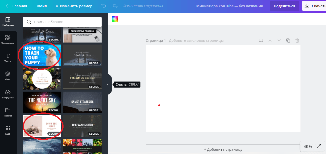 Один из популярных бесплатных графических редакторов — Canva. Создать оригинальную заставку для ролика с его помощью можно за несколько шагов: