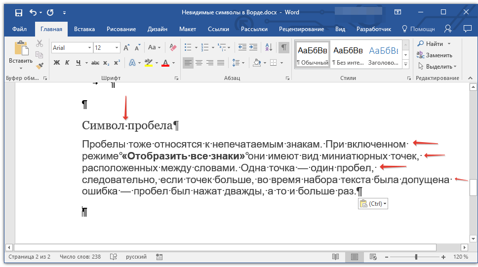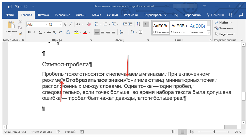 Пробелы тоже относятся к непечатаемым знакам. При включенном режиме «Отобразить все знаки» они имеют вид миниатюрных точек, расположенных между словами. Одна точка — один пробел, следовательно, если точек больше, во время набора текста была допущена ошибка — пробел был нажат дважды, а то и больше раз.
