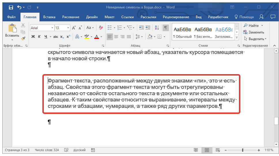 Фрагмент текста, расположенный между двумя знаками «пи», это и есть абзац. Свойства этого фрагмент текста могут быть отрегулированы независимо от свойств остального текста в документе или остальных абзацев. К таким свойствам относится выравнивание, интервалы между строками и абзацами, нумерация, а также ряд других параметров.