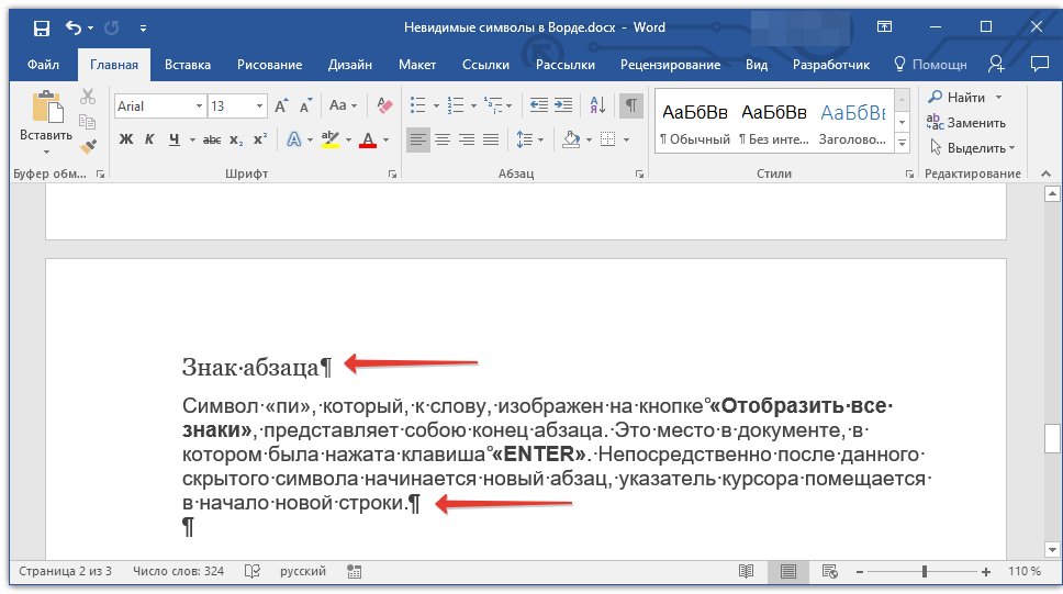 Символ «пи», который, к слову, изображен на кнопке «Отобразить все знаки», представляет собою конец абзаца. Это место в документе, в котором была нажата клавиша «ENTER». Непосредственно после данного скрытого символа начинается новый абзац, указатель курсора помещается в начало новой строки.