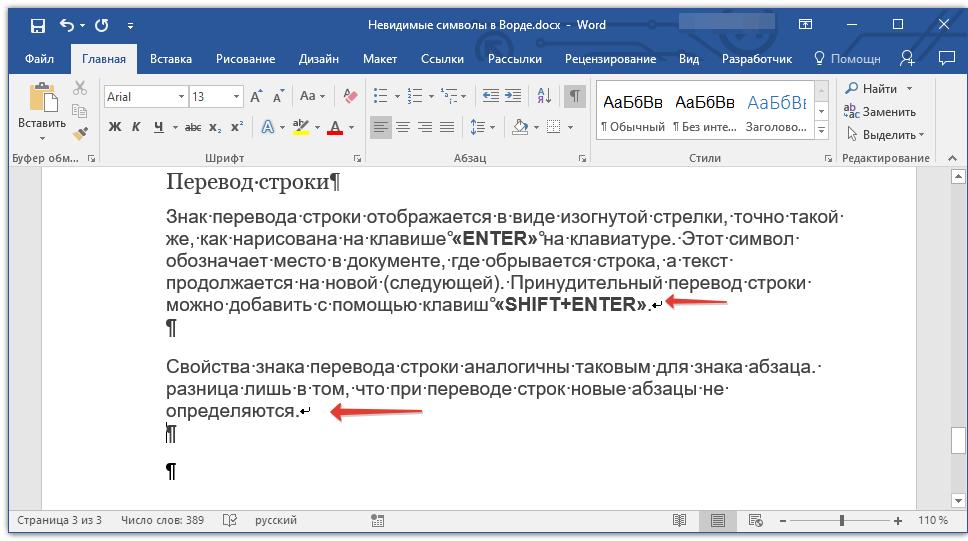Знак перевода строки отображается в виде изогнутой стрелки, точно такой же, как нарисована на клавише «ENTER» на клавиатуре. Этот символ обозначает место в документе, где обрывается строка, а текст продолжается на новой (следующей). Принудительный перевод строки можно добавить с помощью клавиш «SHIFT+ENTER».