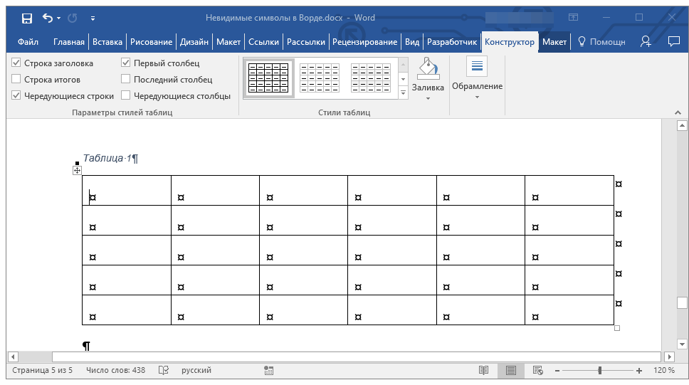 Этот символ можно увидеть в таблицах. Находясь в ячейке, он обозначает конец последнего абзаца, расположенного внутри текста. Также, этот символ обозначает фактический конец ячейки, если она пустая.