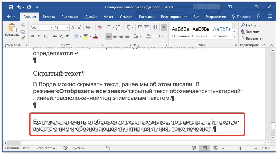 Если же отключить отображение скрытых знаков, то сам скрытый текст, а вместе с ним и обозначающая пунктирная линия, тоже исчезнет.