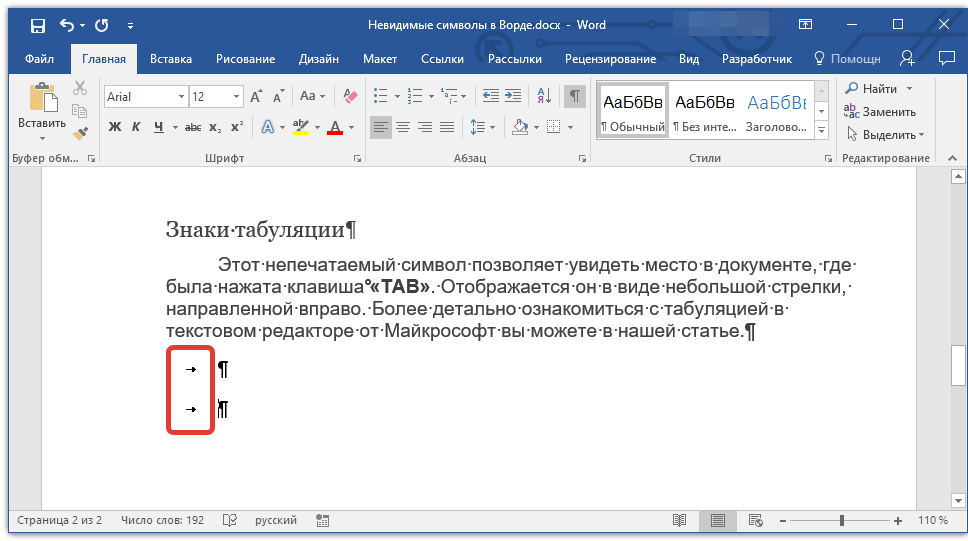 Этот непечатаемый символ позволяет увидеть место в документе, где была нажата клавиша «TAB». Отображается он в виде небольшой стрелки, направленной вправо. Более детально ознакомиться с табуляцией в текстовом редакторе от Майкрософт вы можете в нашей статье.