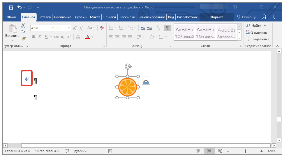 Символ привязки объектов или, как его называют, якорь, обозначает место в документе, в которое была добавлена, а затем изменена фигура или графический объект. В отличии от всех остальных скрытых знаков форматирования, по умолчанию он отображается в документе.
