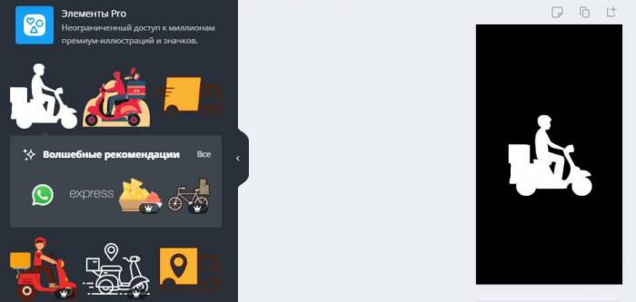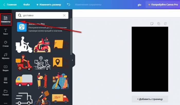 Если нужна иконка, тогда идем в «Элементы» и пишем название иконки, например «Доставка».