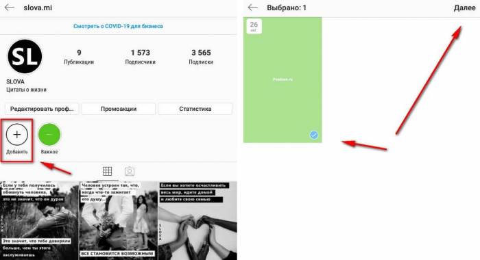 - Если сохраняли, как сторис, то создаем новую подборку в актуальном и добавляем туда только что созданную сторис из архива. Обложка автоматически подставится из добавленной истории.