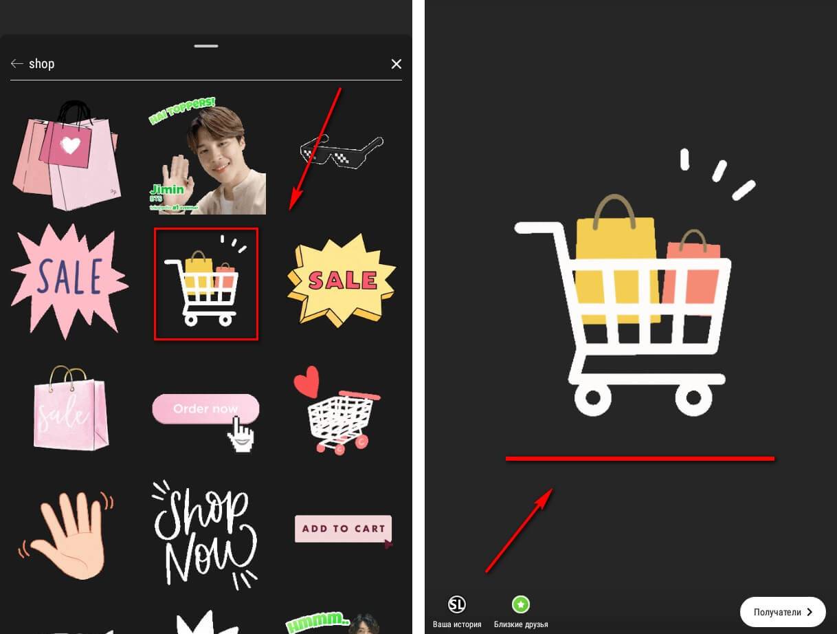 Пишем название иконки, например, «Shop». Выбираем подходящую по смыслу гифку и ставим в центр сторис. Можно чуть увеличить.