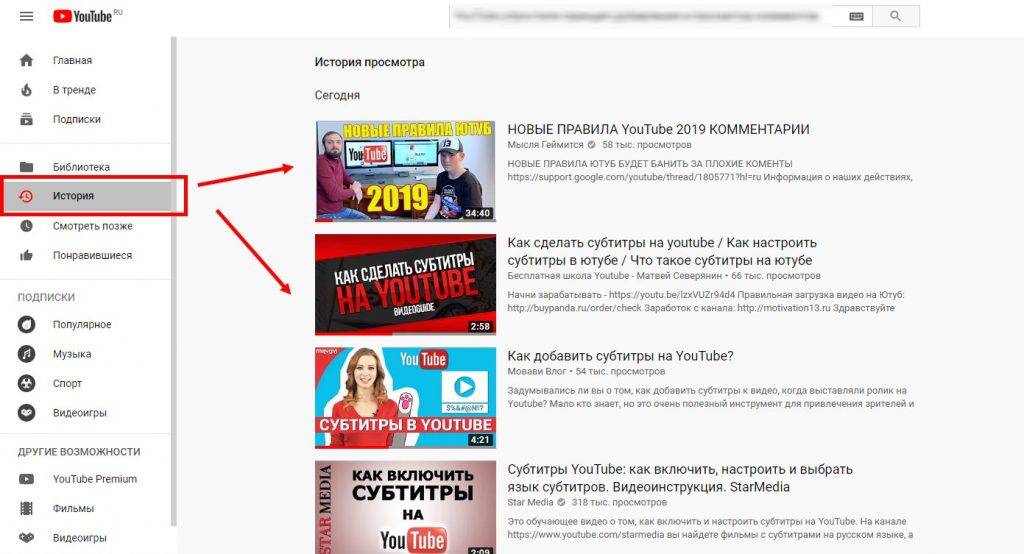 - Перейдите в раздел Просмотренные. Выше мы отмечали, что здесь отображаются все ролики, которые вы смотрели ранее.