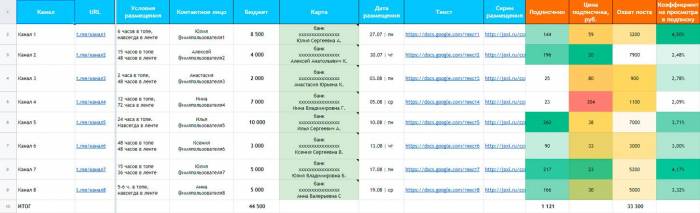 - Перед публикацией рекламного поста на втором канале-доноре делаем срез — сколько пришло подписчиков с предыдущего канала и вводим это значение в ячейку столбца L.