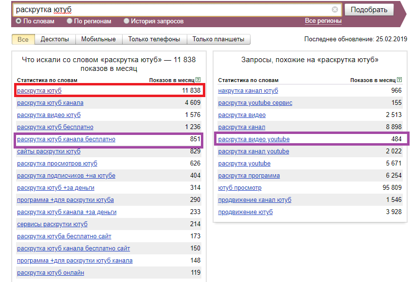 Первый шаг в продвижение ролика – это его оптимизация. Правильно заполненные метаданные: название, теги и описание к видеоролику. Там обязательно должны быть ключевые запросы – фразы, которые пользователи YouTube вводят, когда ищут интересный контент. Для подбора ключей существуют специальные сервисы, один из распространенных «Яндекс.Вордстат».