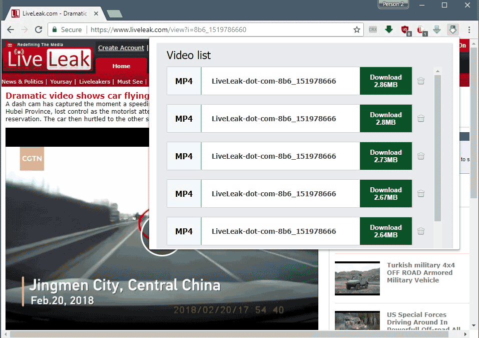 Щелчок на значке отображает список найденных на нем видео, и щелчок по любому из перечисленных видео открывает подсказку сохранения.