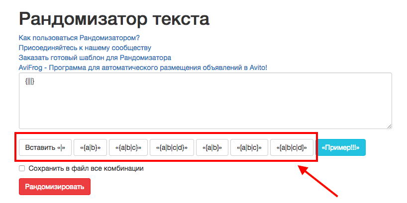 - Заполнить поле с текстом. Сервис потребует тегов рандомизации – фигурных кавычек, внутри которых через прямую линию будут перечислены варианты – это дополнительная защита от преждевременного бана.