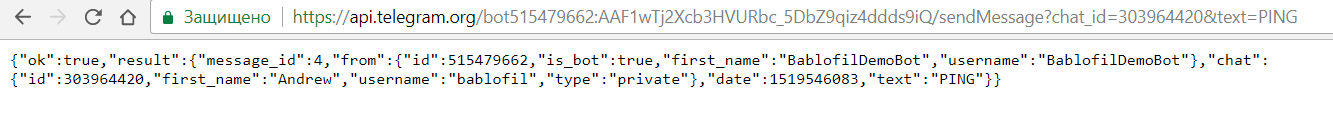 Соответственно, замените API, chat_id и текст сообщения на свои. Я отправляю слово PING как сообщение бота.
