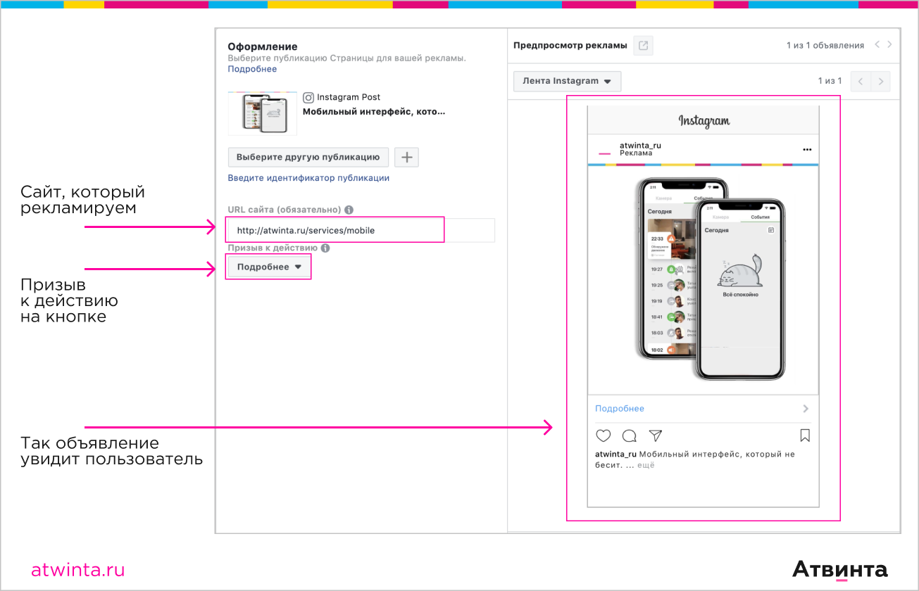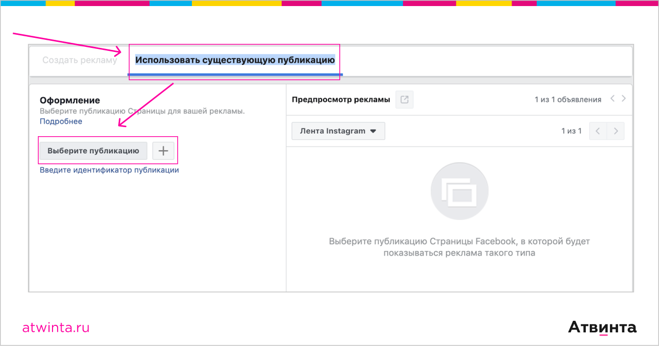 Объявление можно создать с нуля, а можно — рекламировать уже готовый пост из аккаунта в Instagram.