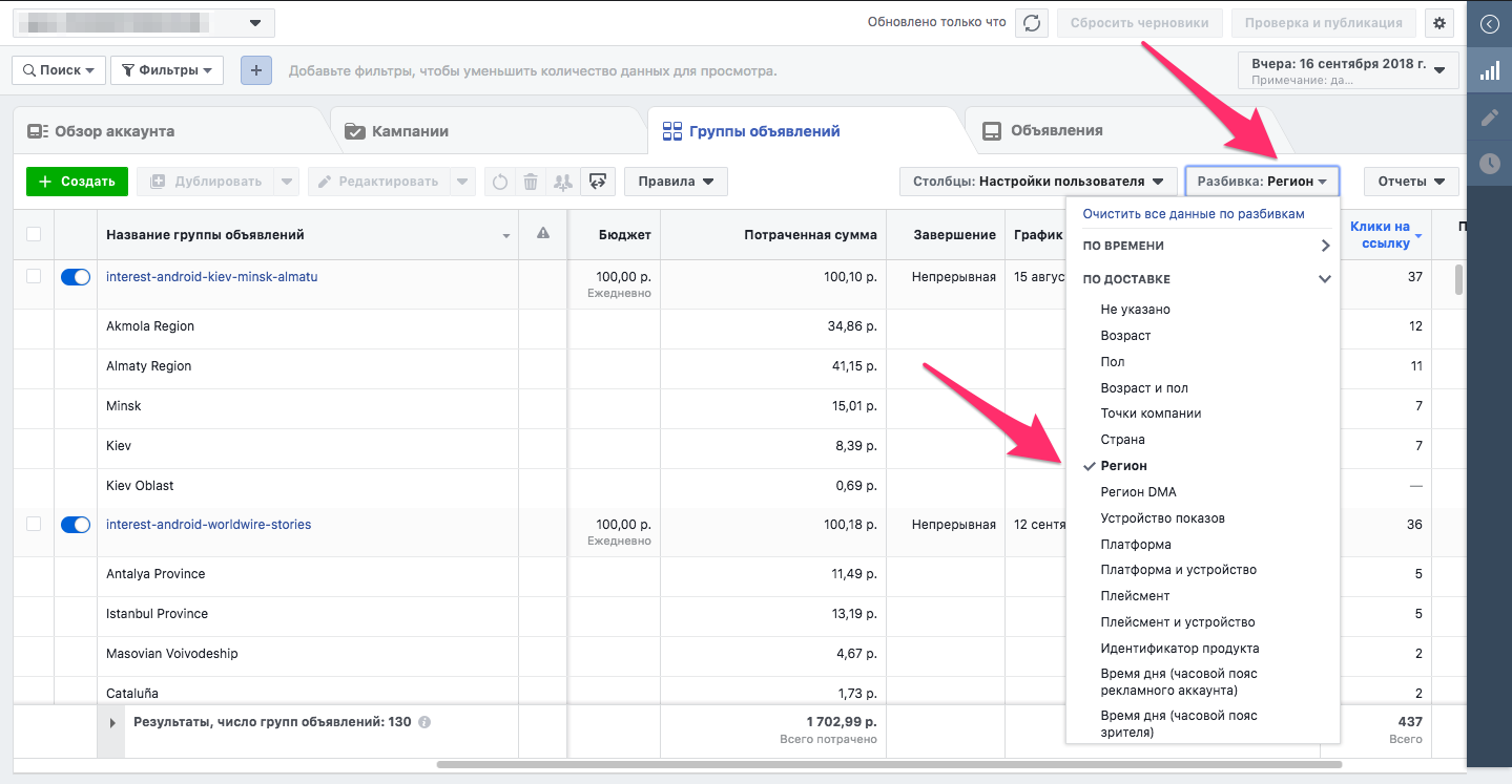 Например, вам необходимо узнать успех рекламной кампании по региону. Не проблема — выбирайте «Разбивку», а затем «Доставку» по региону.