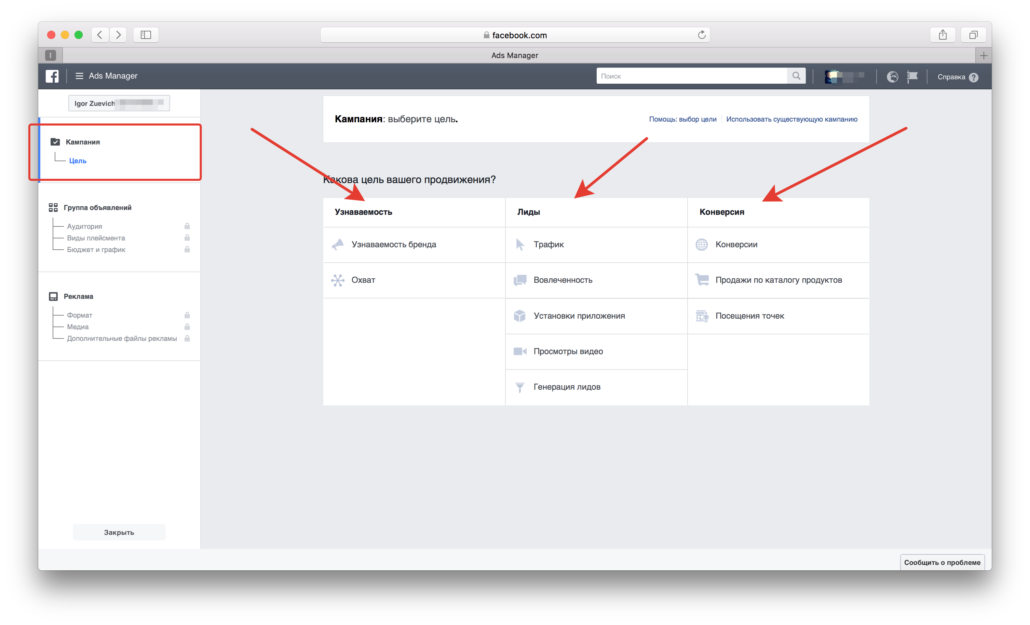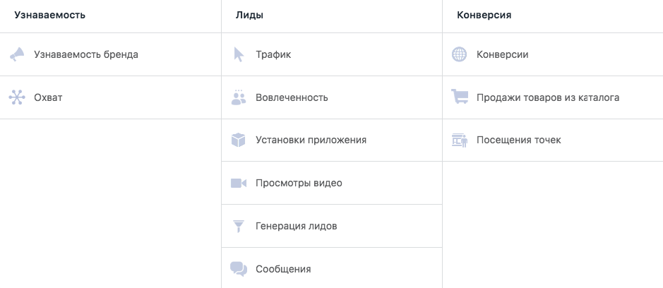 Всего существует 11 рекламных целей и всех их Вы можете видеть на изображении ниже.
