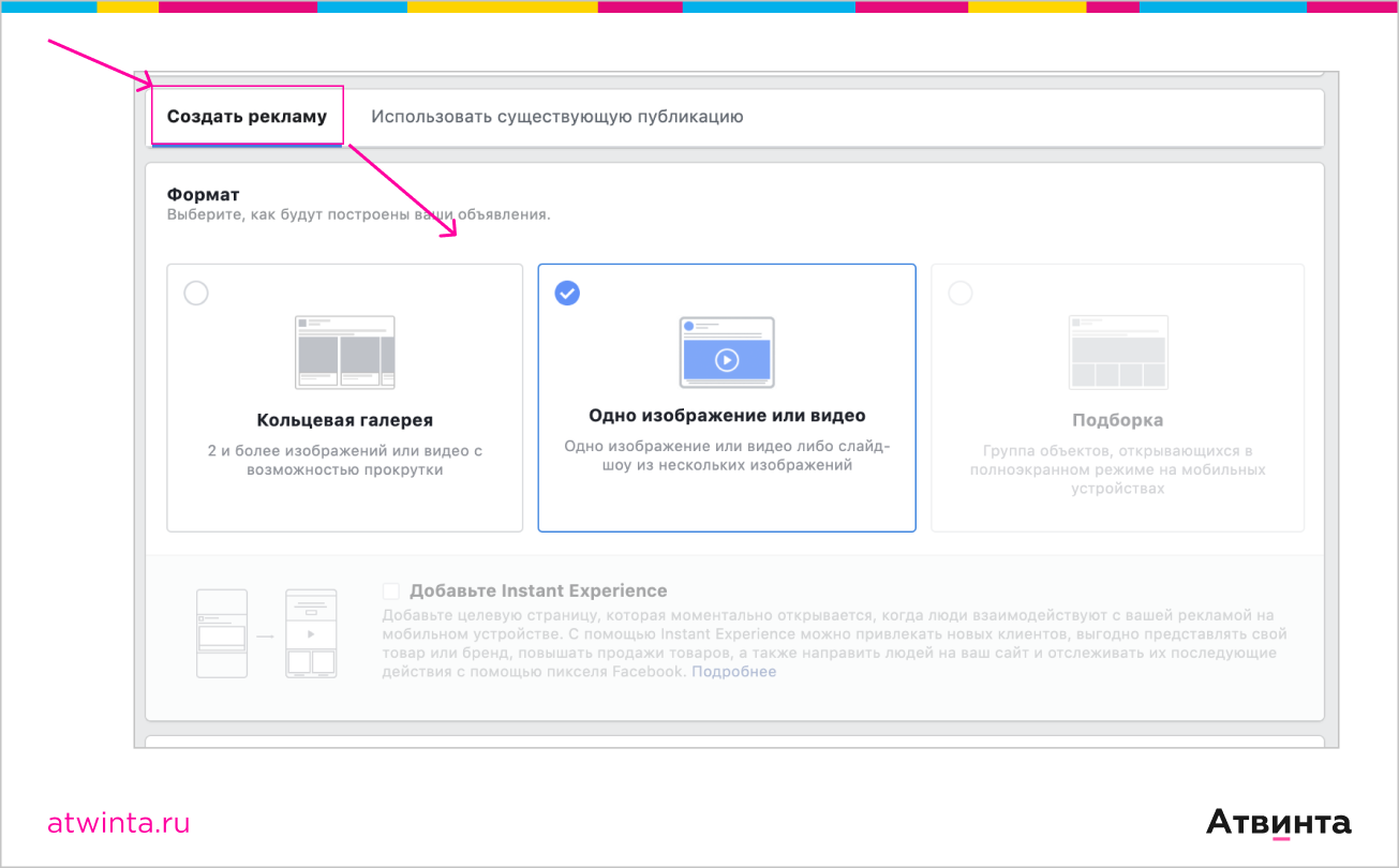 Выбираем вкладку «Создать рекламу» и определяемся с форматом. Одно изображение или видео подойдет для рекламы одного товара или услуги, а «Кольцевая галерея» и «Подборка» удобны, чтобы прорекламировать несколько товаров или показать один товар со всех сторон.